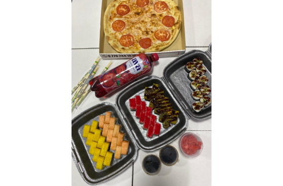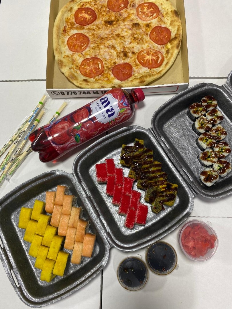 Комбо "Мед Академия", 10 шт Филолайт, 10 шт Цезарь жаренный, 10 шт Калифорния жаренный, 10 шт Калифорния, 10 шт Капа Маки, Пицца Маргарита, Фри 1-порция + 1 литр лимонад AVA в подарок