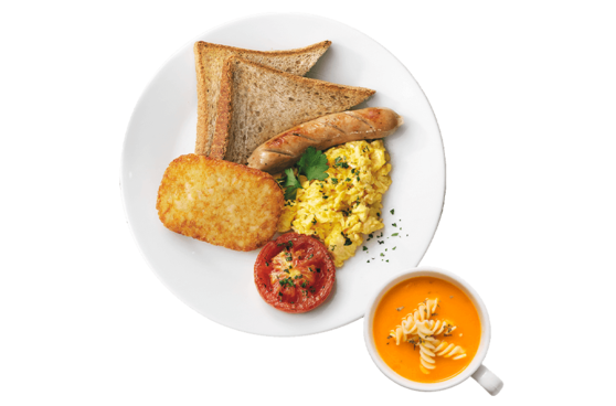 Омлет, сосиска куриная, тосты цельнозерновые, крем суп, шницель, томат.